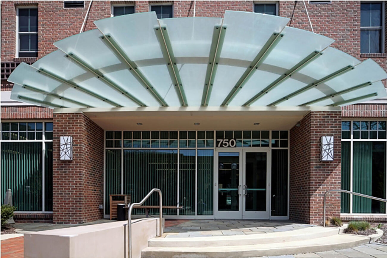 The site improvements included many landscaping changes to the front and back entrance plazas, a new fenced patio enclosure, repairs to the sidewalks and curbs, and a new parking area.