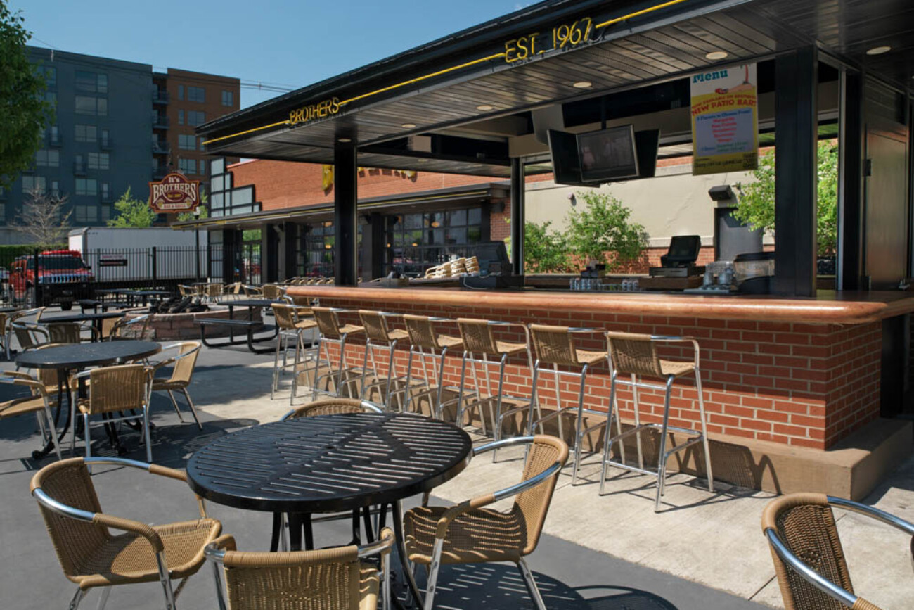 BROTHERS BAR THIS PROJECT INVOLVED DESIGNING A FREE-STANDING SERVING COUNTER FOR THE EXISITNG EXTERIOR PATIO SPACE. THE STRUCTURE ENCLOSES OVER 50 LINEAR FEET OF COUNTER HOLDING COOLERS AND SERVING EQUIPMENT.
